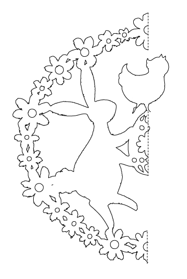 This template is a little ragged, so you'll have to imagine smooth lines where smooth lines should be. Also, the holes in the flowers, I just used a .25 and a .125" hole punch. So much easier. The trickiest part about this cut is remembering not to cut out the chicken part while it's folded. Cut out everything else (well, you can save the hole punching for last) and THEN cut out the chicken.
